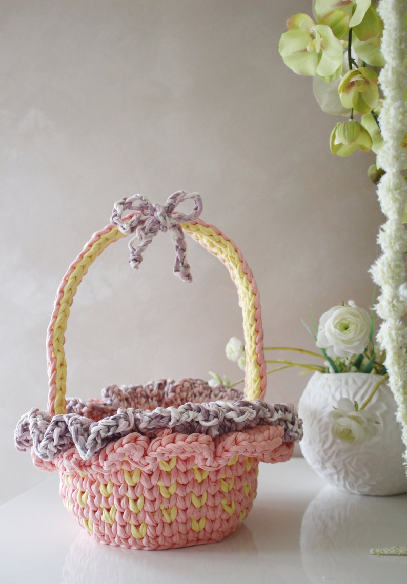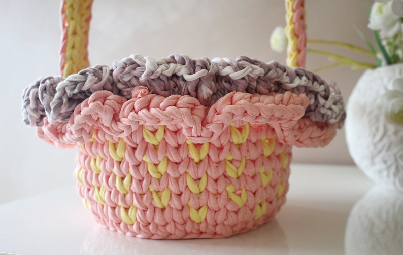 The sweetest crochet Easter Basket Pattern using t-shirt yarn and ruffles!